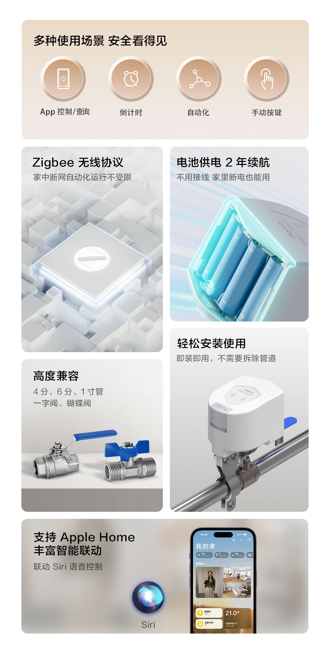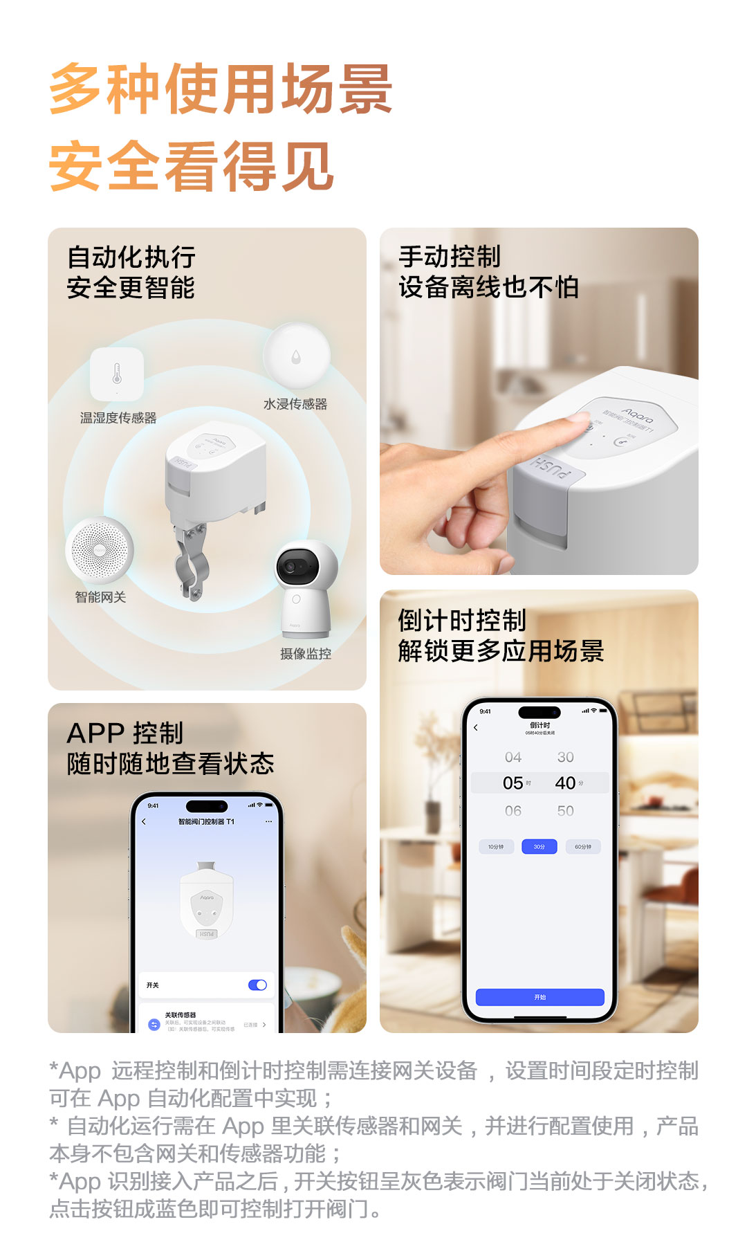 无论是通过手机App、自动化场景,还是倒计时控制、按键控制和手动控制,Aqara智能阀门控制器T1都能满足用户对多样化场景的需求,带来灵活便捷的操作体验。