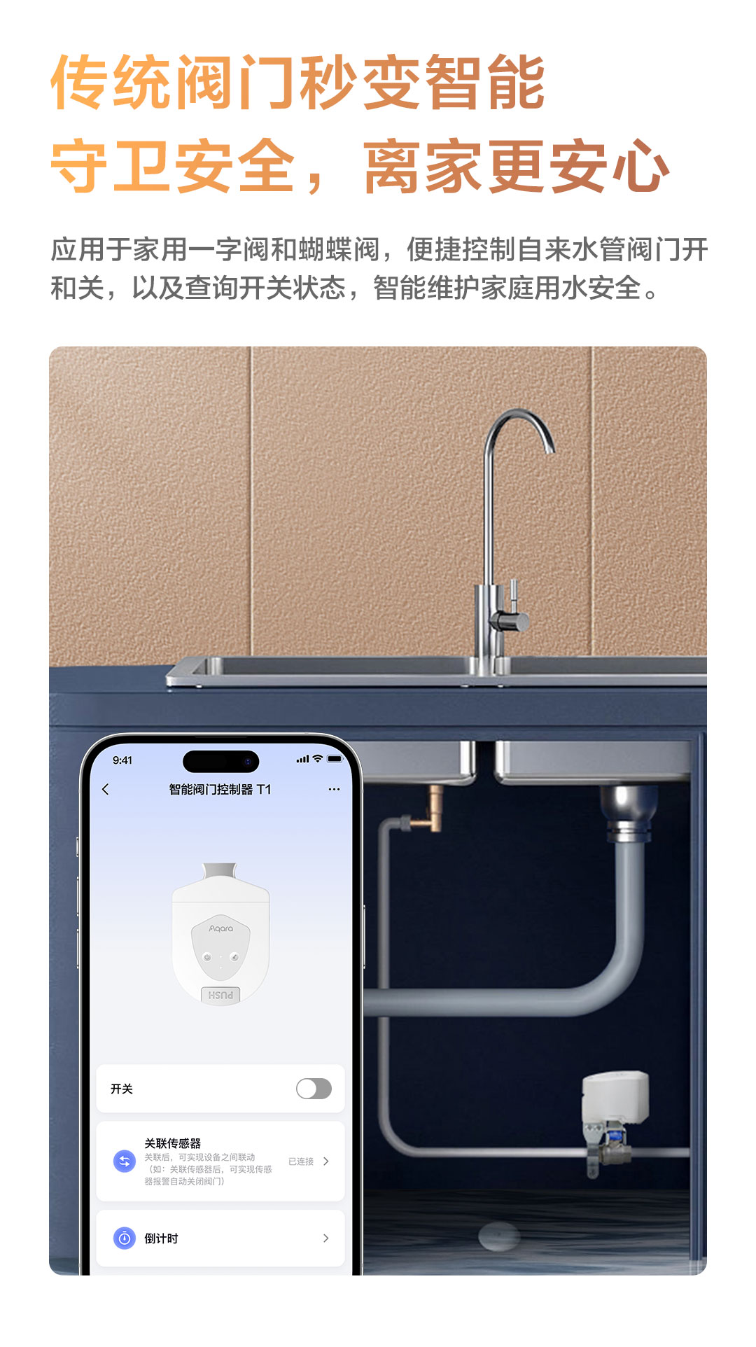 Aqara智能阀门控制器T1 可以与Aqara 水浸传感器无缝配合。当传感器检测到水浸时,Aqara智能阀门控制器T1可以自动关闭阀门,避免水灾带来的损失。此外,用户还能通过Aqara Home App设置倒计时或定时开关,轻松管理用水时间,如晚上自动关闭阀门,早上自动开启,进一步提升生活便利性。