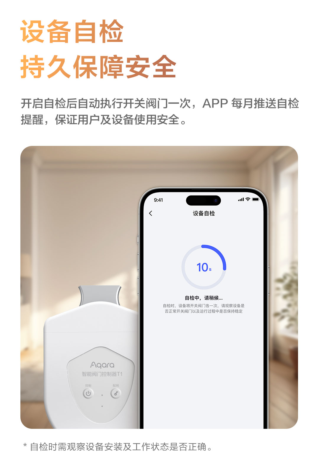 Aqara智能阀门控制器T1内置设备自检功能,每月会自动提醒用户进行自检,确保设备运行正常,始终守护家居水安全。即使出现低电量、工作超时或设备异常的情况,T1也会及时提醒用户,确保阀门始终处于最佳工作状态。