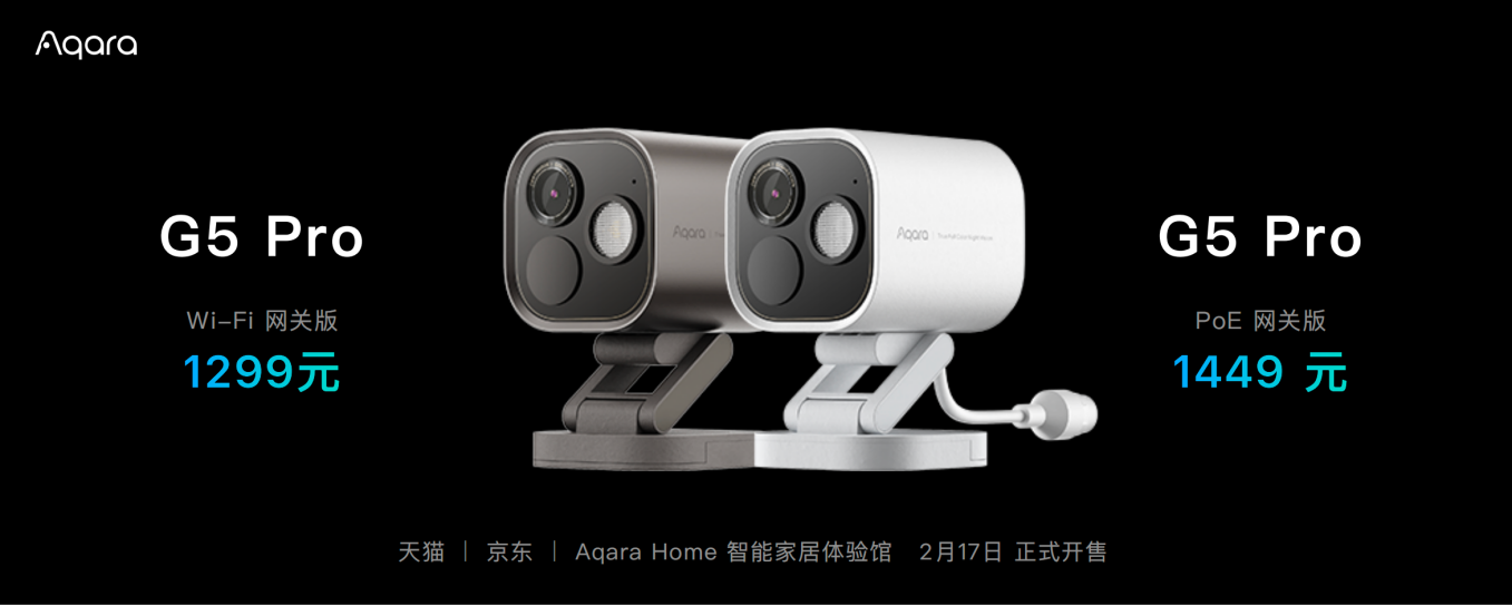 Aqara智能AI摄像机G5 Pro是目前市面上尺寸最小的黑光全彩摄像机之一,凭借“Premium True Full-Color黑光全彩夜视”技术,它能够在极低光照环境中精准还原色彩,超越普通摄像机的表现。G5 Pro也是首款支持Apple HomeKit安防视频的摄像机,内置Zigbee与Thread双协议,并支持Matter协议。搭配本地化AI识别功能,G5 Pro可识别多达11种场景,包括人脸、人体、动物、快递包裹、车辆进出、咳嗽、宠物叫声与婴儿啼哭等,极大提升了安防联动体验。该产品提供PoE和Wi-Fi两种版本,将于2月17日正式上市。
