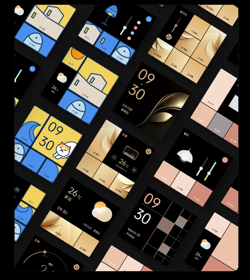 在人性化设计方面,Aqara 妙控场景屏 S100 同样表现出色,能够贴心适配各类场景需求。它配备了 3 个灯控开关和 6 个无线开关,6 个页面共 54 个妙控卡片,用户可以根据自己的喜好和需求对这些卡片进行自定义设置。界面布局也能够根据不同空间以及家庭成员的需求进行自由定制,满足个性化使用体验。产品精选了多款风格各异的默认主题,并且会持续更新更多主题,以契合家的高定格调。用户可以根据家庭成员的实际需求,定制观影、归家、离家、助眠、晚安等多种场景模式,实现一键切换,畅享便捷。