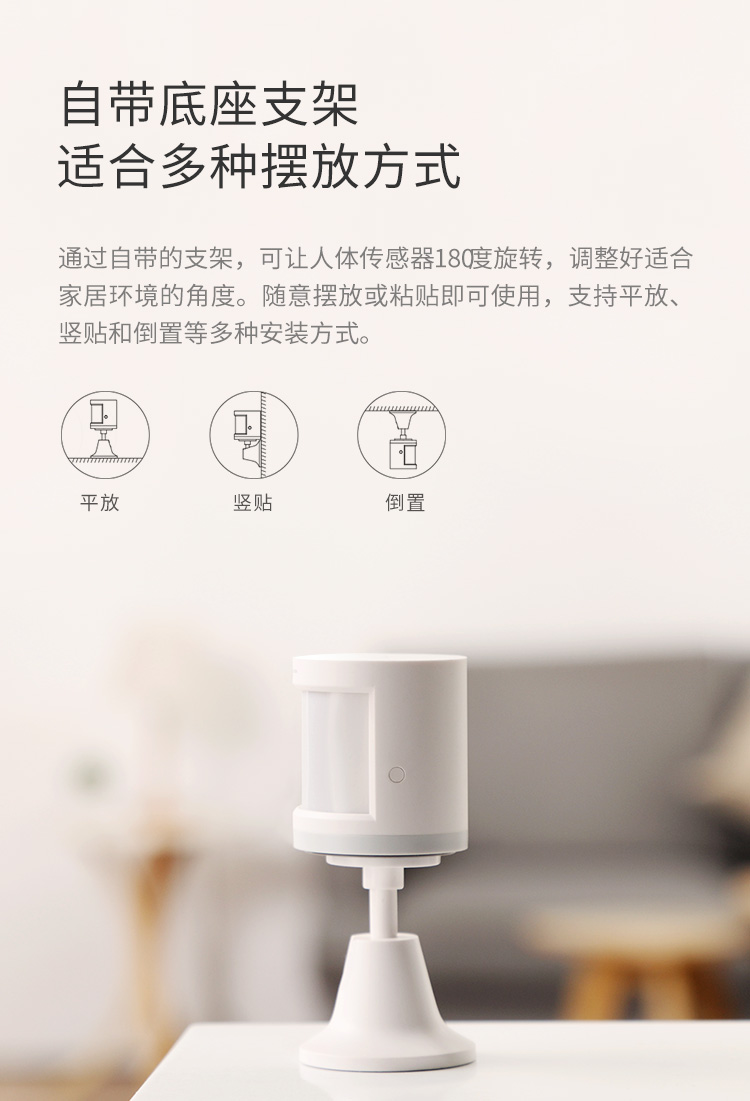 Aqara人体传感器免安装工具,随意摆放或粘贴即可使用,支持平放、竖贴和倒置等多种安装方式