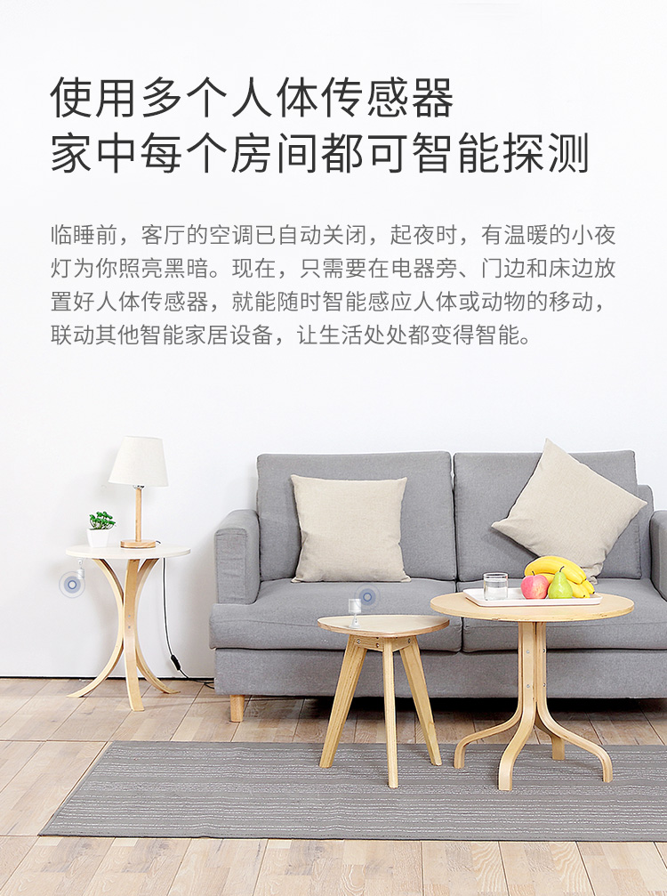 临睡前,客厅的空调已自动关闭,起夜时,有温暖的小夜灯为你照亮黑暗。现在 只需要在电视机旁、门边和床边放置好人体传感器,就能随时智能感应人体或动物的移动,联动其他智能家居设备,让生活处处都变得智能。