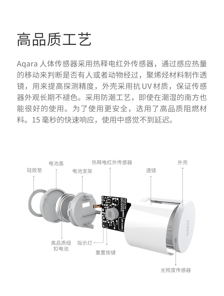 Aqara人体传感器采用热释电红外传感器,通过感应热量的移动来判断是否有人或者动物经过,聚烯烃材料制作透镜,用来提高探测精度,外壳采用抗UV材质,保证传感器外观长期不褪色。采用防潮工艺,即使在潮湿的南方也能很好的使用。为了使用更安全,选用了高品质阻燃材料。15毫秒的快速响应,使用中感觉不到延迟。